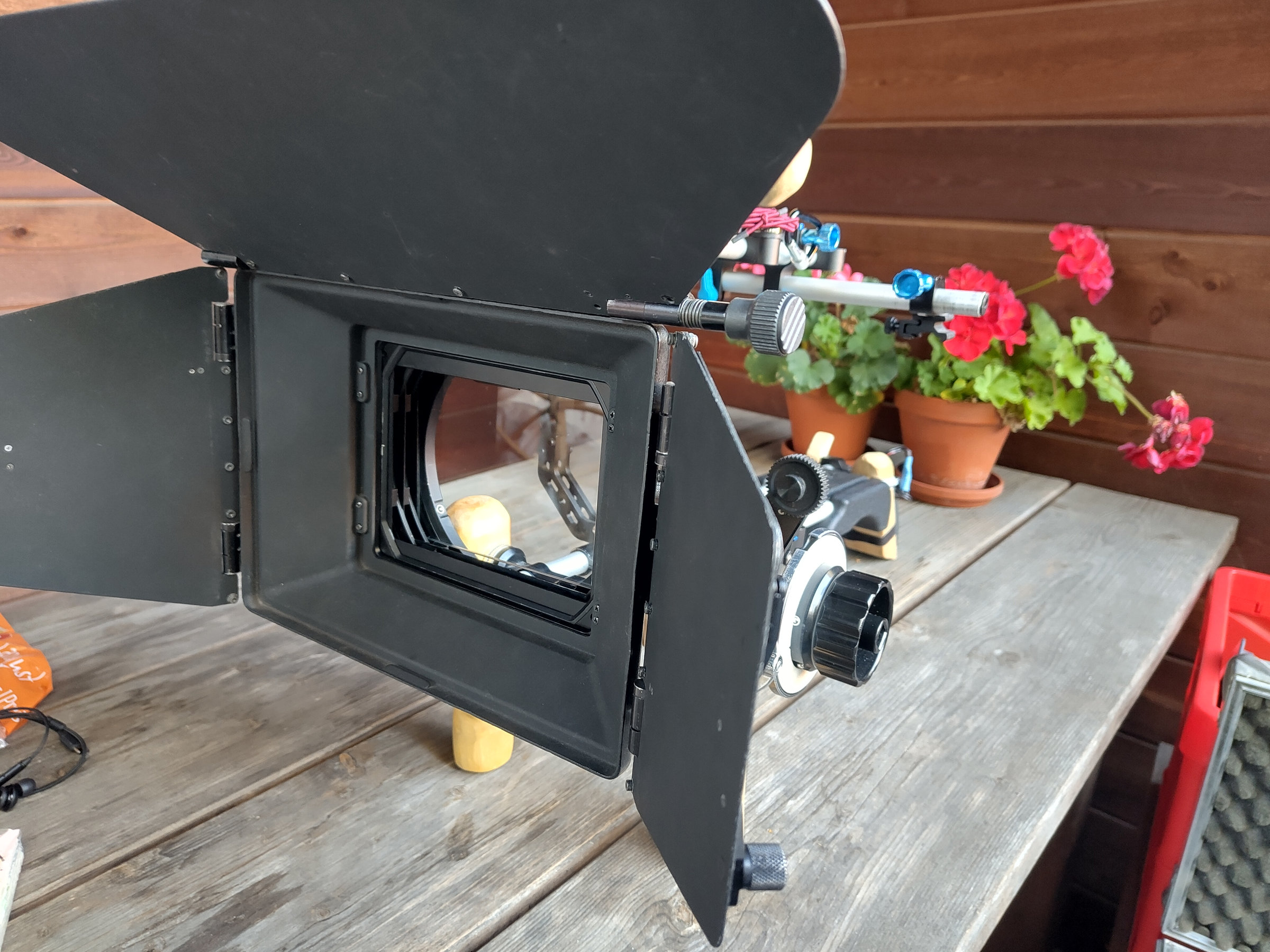 Wozu braucht man eigentlich ein Kompendium? Neben der Gegenlichtabschattung vom Kameraobjektiv und der Halterung von Filtern vor allem für eins: eine professionelle Set-Optik.Lange habe ich mit mir gehadert, ob es das wirklich wert ist. Dann bekam ich die Gelegenheit, preiswert eine hochwertige Mattebox zu übernehmen, und habe sie ergriffen. Nun ist sie da: eine ARRI MB-20 mit Side- und Top-/Bottom-Flags, 3-fach einzeln rotierbaren Filtereinschüben bis 4×5,65 und Swing-Away-Mechanismus mit 15mm-Rod-Clamp und 19mm-Rod-Adapter.