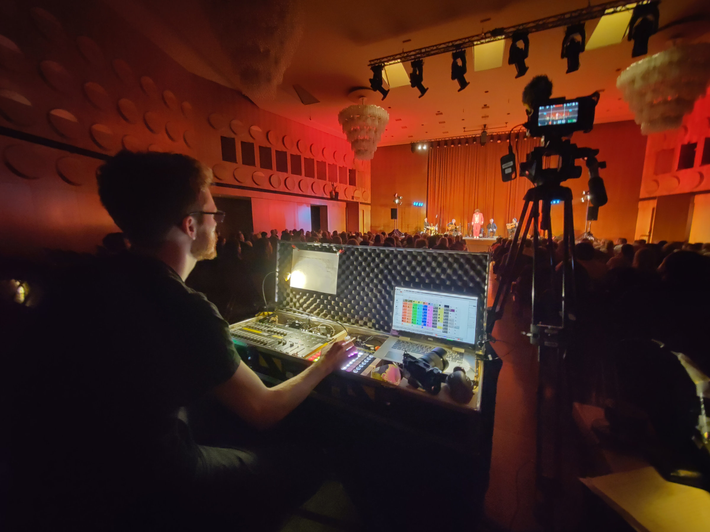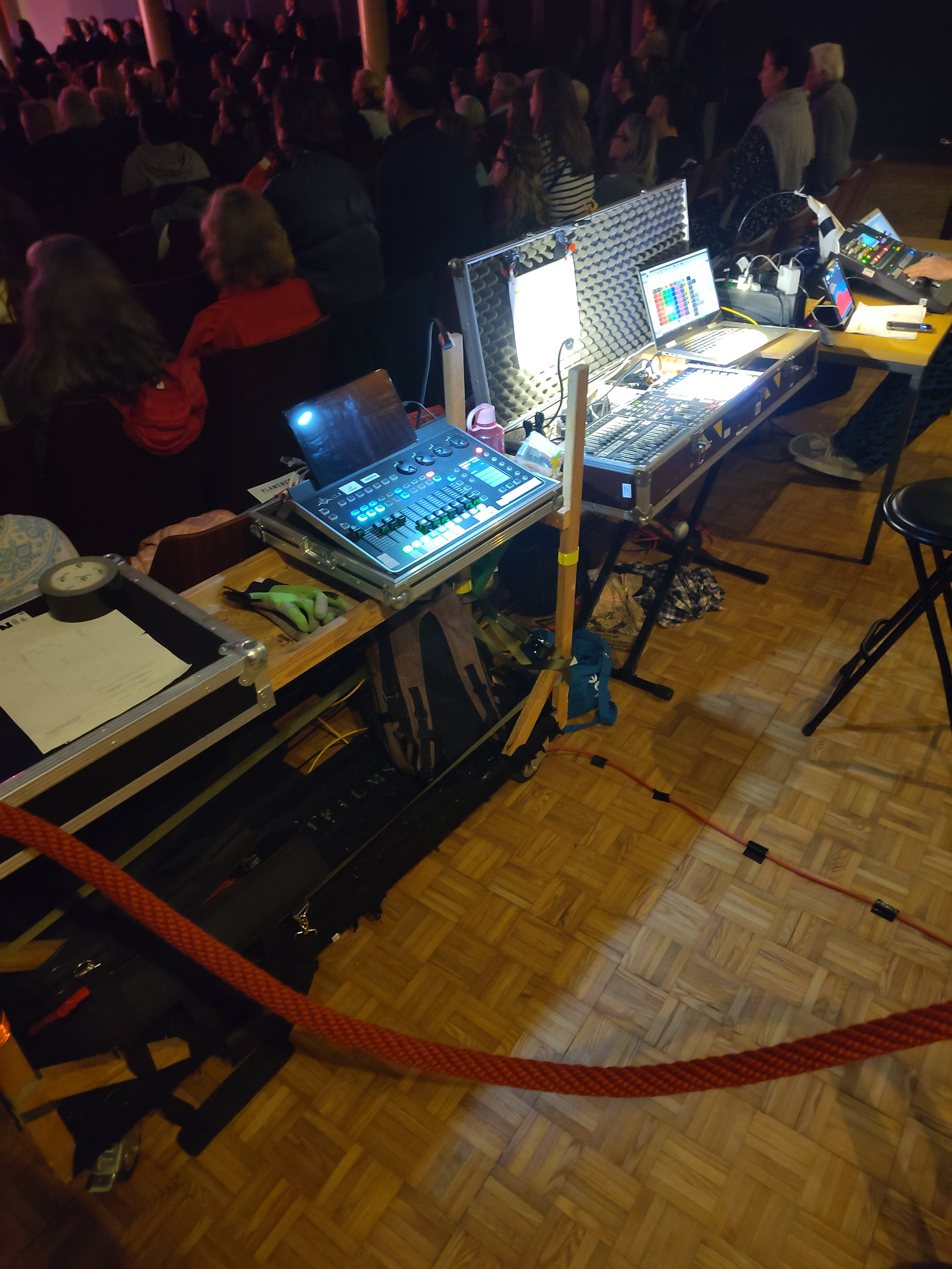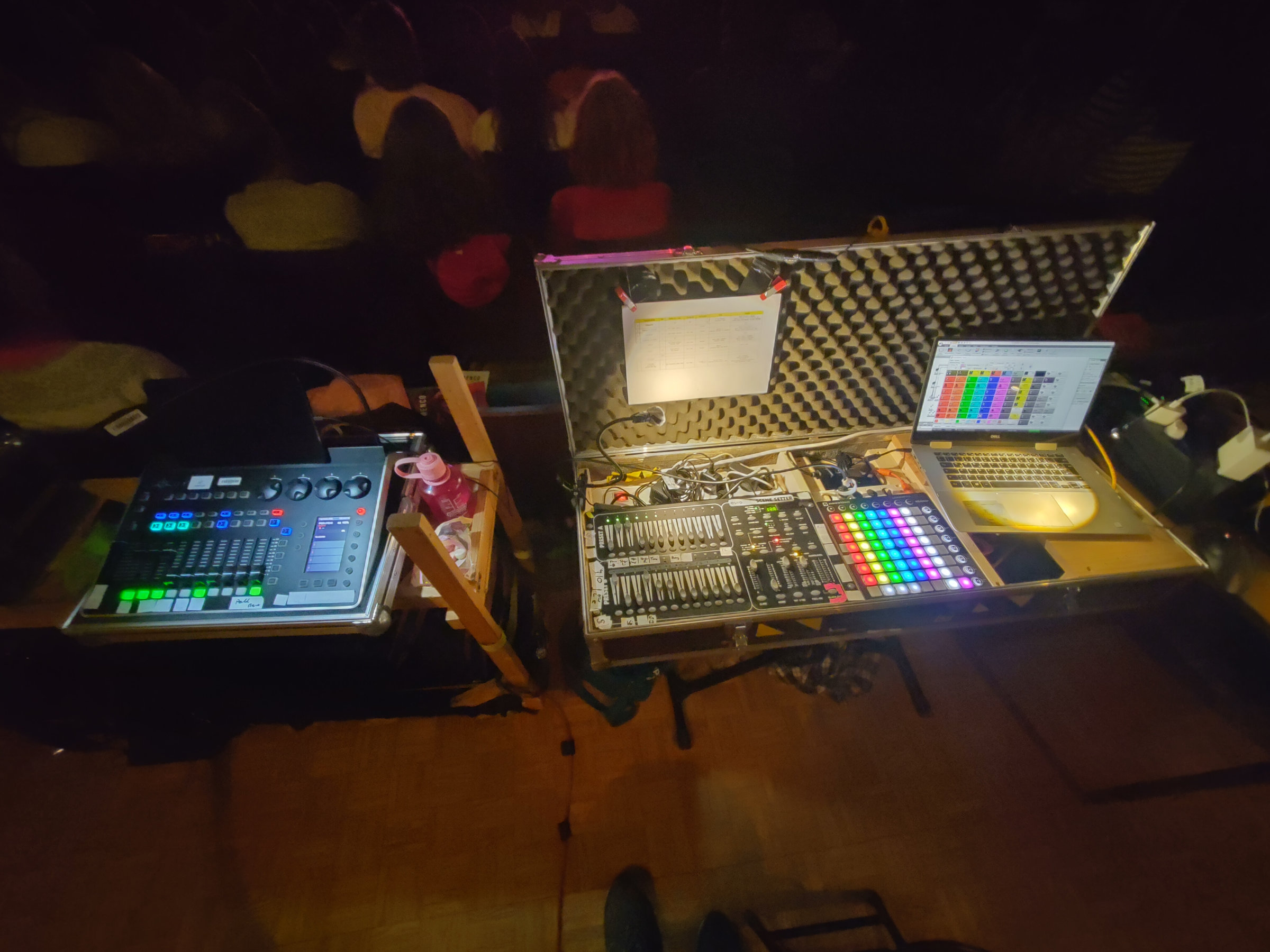 Licht-Controller-Koffer Er ist zwar furchtbar schwer und sperrig; dafür spare ich mir lästige Auf- und Abbauzeit für meine softwarebasierte Lichtsteuerung. Eingebaut sind: Laptop mit Netzteil und Trackball-Maus WLAN-Router + PoE-Injektor Novation Launchpad Mk2 24-Kanal DMX-Pult zum manuellen Faden des Frontlichts Leuchtkraft RDMX-8 DMX-Recorder/-Merger div. Stromverteilung + Licht